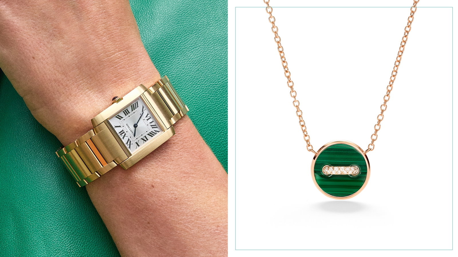Pomellato Collier „Pom Pom Dot“ 750/- Roségold, Diamanten 0,05 ct., Malachit, Perlmutt. 2.850 EUR